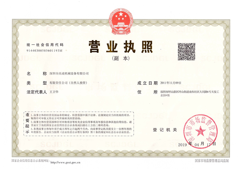 深圳市高成機(jī)械設(shè)備有限公司,1998年創(chuàng)立于深圳市坪山新區(qū),專門從事試驗(yàn)設(shè)備和自動(dòng)化設(shè)備的研發(fā)和生產(chǎn)的高新科技企業(yè)。產(chǎn)品遠(yuǎn)銷國內(nèi)外多個(gè)國家和省市,深受廣大客戶的信賴和好評!高成機(jī)械設(shè)備堅(jiān)持以“質(zhì)量第一,服務(wù)至上”為宗旨的經(jīng)營理念。敬業(yè)、守信、專業(yè)、高效的企業(yè)精神,不斷提高在同行業(yè)中的競爭力并與新老客戶建立長期的合作伙伴關(guān)系,公司的誠信、實(shí)力和產(chǎn)品質(zhì)量獲得業(yè)界的認(rèn)可。